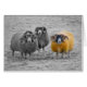 Three Scottish Rams posing for the camera. Two black & white sheep with a single yellow-orange coloured ram with very curly horns.