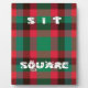 "SIT" and "SQUARE" Text: These words introduce a textual element, creating a unique juxtaposition with the traditional tartan.