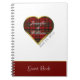 Chic Scottish plaid themed wedding guest notebook, done in white, with a big gold tone framed plaid heart and a red band, across the bottom. The bride and groom's names in white are inside the red, black, and yellow plaid heart, with additional custom text next to the heart and on the bottom red band. Personalise all the text to suit your wedding needs.