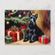 Scottish Terrier by the decorated Christmas tree and festive holiday gifts.