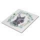 An watercolor portrait of an adorable Scottish Terrier inside a blue green leaf wreath is the feature on this decorative and useful tile. Perfect for any one who loves a Scottie.