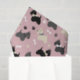 Cute black, grey and wheaten Scottie dogs wearing bows, with pawprints and dog bones on a pink background.