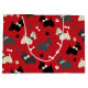 Cute black, grey and wheaten Scottie dogs wearing bows, with pawprints and dog bones on a red background.