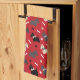 Cute black, grey and wheaten Scottie dogs wearing bows, with pawprints and dog bones on a red background.