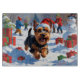 A cheerful Scottish Terrier runs happily through the snowy winter scene, wearing a festive red Christmas hat. This charming design highlights the breed’s distinctive silhouette, wiry coat, and spirited personality while capturing the warmth and joy of the holiday season. A delightful winter moment full of festive cheer.