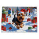 A cheerful Scottish Terrier runs happily through the snowy winter scene, wearing a festive red Christmas hat. This charming design highlights the breed’s distinctive silhouette, wiry coat, and spirited personality while capturing the warmth and joy of the holiday season. A delightful winter moment full of festive cheer.