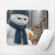 A grumpy snowman wearing a blue hat and scarf stands in a snowy forest as a rabbit holds a carrot beside it, with snow gently falling around them