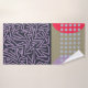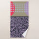 This towel set has a light blue washcloth, a red hand towel, and a bath towel with a mid-century modern abstract design with three different backgrounds, zigzag lines, ovals, and circles, in navy, light blue, red, khaki, and lavender. If you want the same design with different colours, message me.