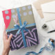 This wrapping paper has a mid-century modern abstract design with three different backgrounds, zigzag lines, ovals, and circles, in navy, light blue, red, khaki, and lavender. If you want the same design with different colours, message me.