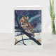 Linda Baysinger Peck's painting of an Eastern Screech Owl, with large, yellow eyes, sitting on a branch in the snow, with the night sky and pine trees.