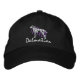 Modern Dalmatian hat has a dog silhouette in front of a purple scribble, and the breed name scripted below. Excellent pet lover embroidery!