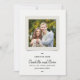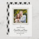 Stylish Photo Save the Date Card featuring your photo surrounded by a border, below which are the words "Save the Date" in a typewriter like font and the couple's names in script in a dark grey colour colour all against an off-white background. Card backside features overlapping off-white lines against a dark grey background.