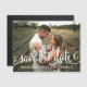 A romantic save the date magnet with a full-bleed landscape photo and flowing white calligraphy "save the date" script with decorative swash flourishes spanning the lower portion of the card. A single clean text line below holds your names, date, and city — simple, elegant, and easy to read. Fully editable to personalise.