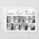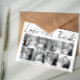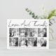 Script calligraphy Wedding Thank You eight photo collage card with the text "Love and Thanks". The backside includes a black and white pattern with the couple's names.