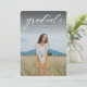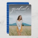 A simple classic script "graduate" in white accentuates a single vertical photo of your grad. This graduation announcement works for both college or high school graduates and is simple enough to let your photo shine. It's a timeless design and also features a striped backer with a customisable colour (default is blue). The words are at the top of the photo but the design is also available with the words at the bottom.
