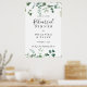 This script green foliage rehearsal dinner welcome sign is perfect for a modern wedding rehearsal. The design features watercolor hand-drawn elegant botanical eucalyptus branches and leaves, arranged in beautiful bouquets and geometric patterns.