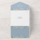 All-in-one greenery floral wedding invitation featuring elegant hearts script typography and monogram initials on a dusty blue background. The invitation includes a perforated RSVP card that features your wedding website QR code. Designed by Thisisnotme©