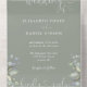 All-in-one greenery floral wedding invitation featuring elegant hearts script typography and monogram initials on a sage green background. The invitation includes a perforated RSVP card that features your wedding website QR code. Designed by Thisisnotme©