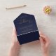 All in one navy blue and gold wedding invitation featuring elegant hearts script typography and monogram initials. The invitation includes a perforated RSVP card with your personalised wedding QR code. Designed by Thisisnotme©