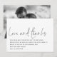 Script Love Thanks Photo Wedding Thank You. Love and thanks is in a set handwritten style with the details beneath. Lots of white space at the top for a contemporary touch! Easily personalise the rest of the text to your own details and replace the sample photo on the back with your own which will automatically change to black and white. If you wish to remove the black and white filter click customise further and chose the filter option and select No Filter.