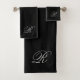 Pretty Script Monogram Initial Grey Black Bath Towel Set. Black background with customisable monogram script text initial in grey. All colours are customisable. We invite you to visit our, GJ Design Co, store on Zazzle to view matching products and more.