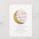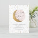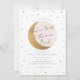 A pretty, baby shower invitation featuring gold star frame and moon with soft pastel watercolor shadow on a clean white background.