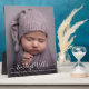 Modern baby photo birth plaque for girl or boy. Simply use this template to add your own custom photo of your own sweet baby, and personalise with baby's name in the elegant trendy script typography.