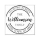A classic circular personalised self-inking stamp design featuring a double circle border with elegant script name and return address text. Designed by Thisisnotme©