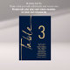 Script Navy Gold Table Number Names Seating Chart. Edit you number for each table and add to your cart separately. Same design is on both sides, use for a hanging display so guests can find their seat or on each table. In classic navy blue with gold writing. Easily personalise the table number and your guest names. The same design is on both sides and will update simultaneously as you change the words to your own.