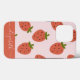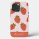 Script Strawberry iPhone 13 Pro Case. Strawberries on light pink background make this a cute berry good design to wrap your phone in. Easy to personalise with script lettering your name.