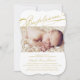This modern religious invitation flat card accommodates a single photo layout and features an elegant and classic calligraphy script with a simple rosary cross accent.