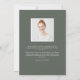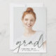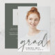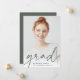 Modern graduation announcement for your class of 2022 grad features a single vertical/portrait orientated photo, with "grad" along the bottom in dark sage green handwritten script lettering. The graduate's name and school appear along the bottom. Add a personal announcement to the back, along with an additional photo.