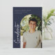 Modern scripted "graduate", arch frame photo graduation announcement/invitation. Features, white typography on navy blue backgrounds.