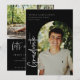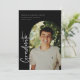 Modern scripted "graduate", arch frame photo graduation announcement/invitation. Features, white typography on black backgrounds.
