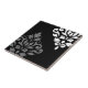 Scroll and leaf damask in a vintage style design, with grey and white detail on a black background.