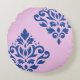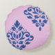 Scroll and leaf damask repeat design in blue detail on a pink background.