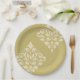 Scroll and leaf damask repeat design in cream colour detail on a faux gold colour background.