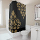 Scroll and leaf damask design in gold colour detail on a black background in a modern style print.