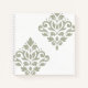 Scroll and leaf damask repeat design in sage green detail on a sage white background.