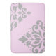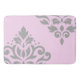 Scroll and leaf damask in a vintage style design, with grey detail on a light pink background.