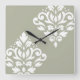 Scroll and leaf damask repeat design in white detail on a sage green background.