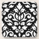 Scroll and leaf damask in a vintage style large patterned design, with white detail on a black background.