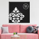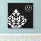 Scroll and leaf damask off-set (bottom left) design in white detail on a black background in a modern style art print with encircled initial top right to personalise.