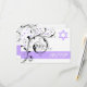 Elegant floral scroll leaf white, lavender purple flourish and Star of David Bat Mitzvah (בת מצוה) response/reply RSVP card, featuring black scroll leafs, swirls, curls and purple dots on white background. There is a purple band with the text RSVP to the bottom and lime green text on the back. Classy, modern, stylish and chic design perfect for your event. Change purple (background) to any colour!