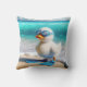A fluffy white duckling stands on a sandy beach, wearing blue flippers and diving goggles