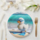 A fluffy white duckling stands on a sandy beach, wearing blue flippers and diving goggles