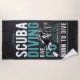 This sports design features the text "I'd rather be Scuba Diving" in modern white and teal script with the silhouette of a a diver in white. #scuba #diving #dive #diver #black #white #teal #aqua #aquatic #sports #beach #sea #ocean #trendy #trending #style #stylish #modern #popular #beach #towels #beachtowels #gifts