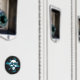 Skull with a scuba diving mask with silhouettes of sharks circling around.