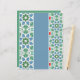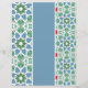 Decorative tiles with geometric patterns in shades of blue and green are showcased, separated by a solid light blue vertical stripe. The patterns on the tiles include star and diamond shapes surrounded by dots, lending a mosaic-like quality to the overall design.