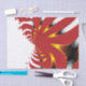An abstract art design of a mythical creature reminiscent of a sea anemone, in red, yellow, white and gold.